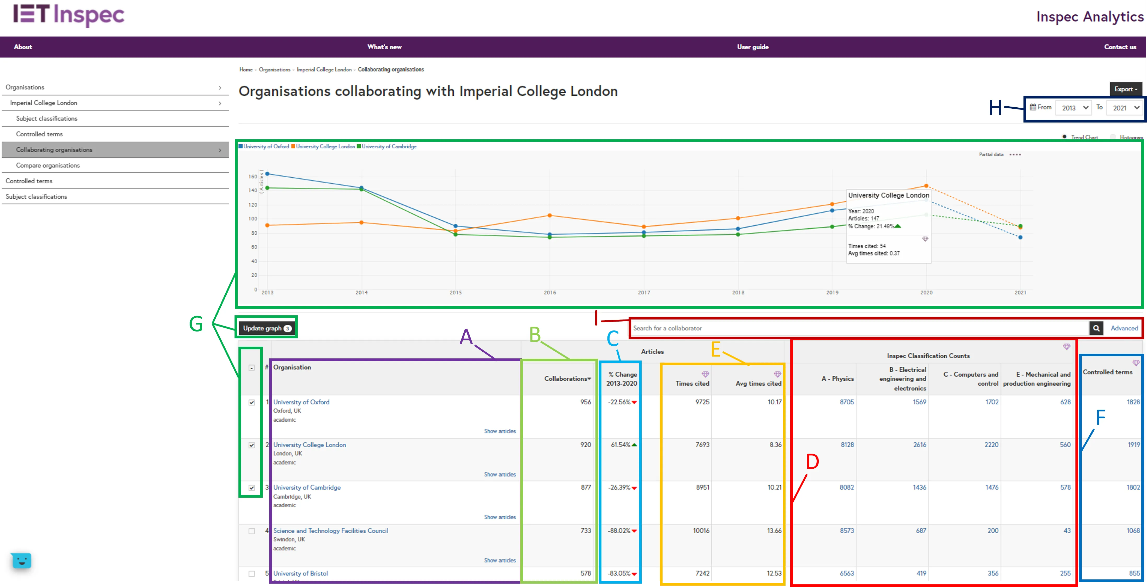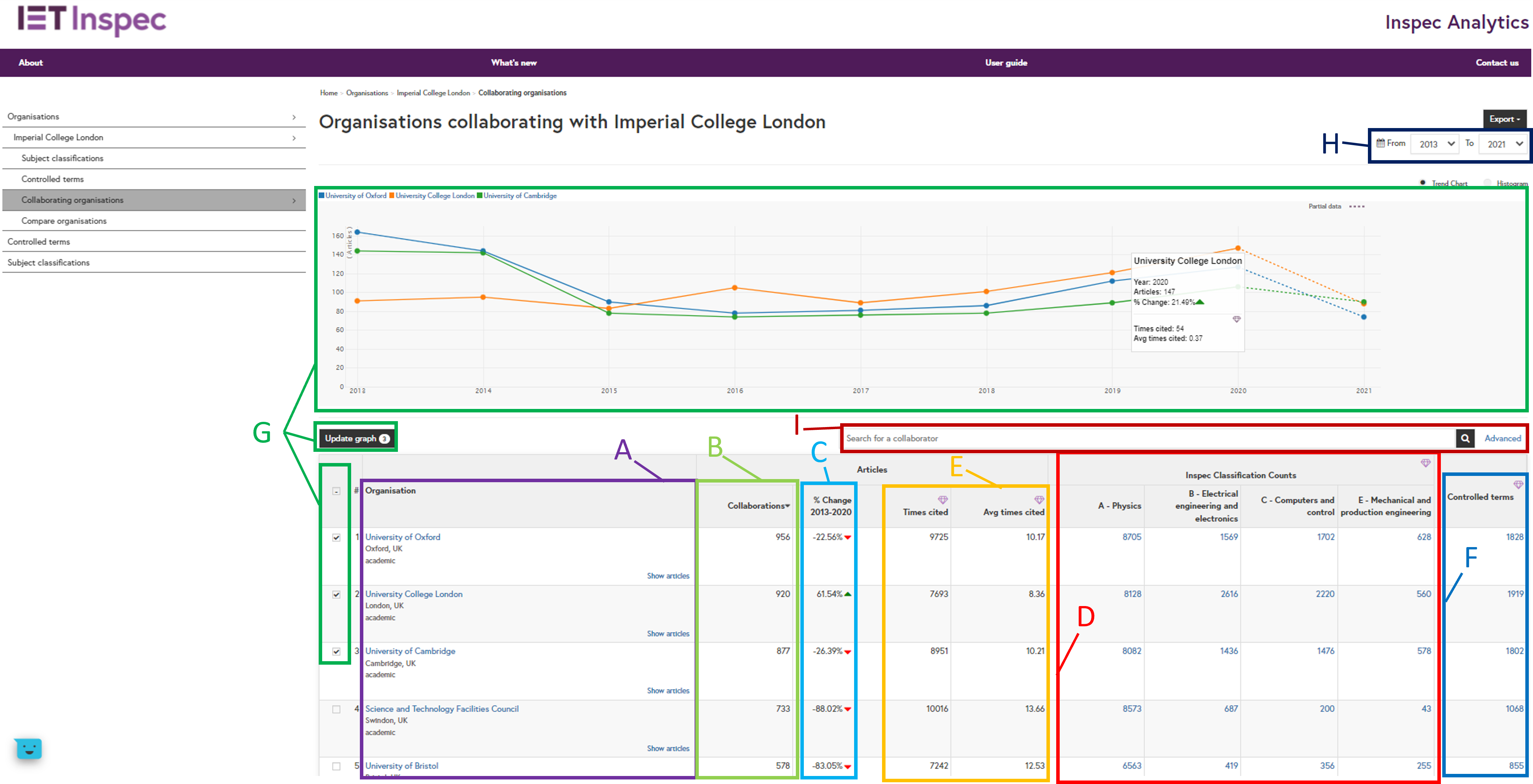 Inspec Classification Counts columns (D) - Inspec Analytics Plus only: The subject classification columns show the number of subjects the selected organisations have collaborated on under each classification. Click on the number to view and explore these in more detail.