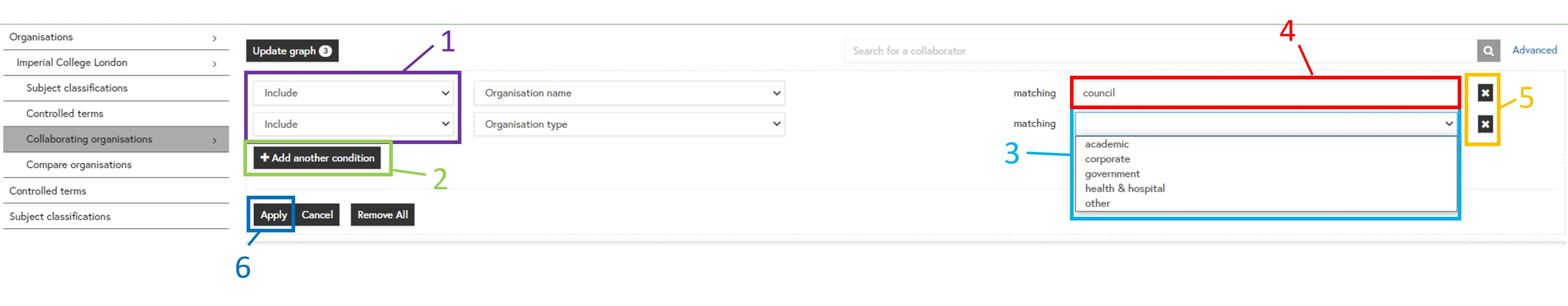 Advanced Search (3): You can filter by the type of organisation to focus on academic or industry collaborations.