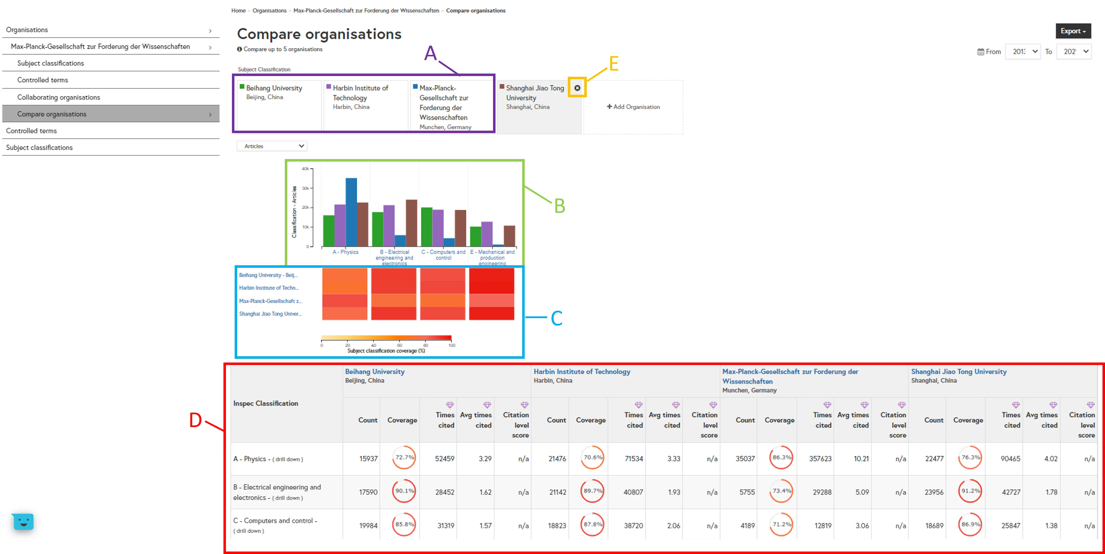 Explore Classification Hierarchy (A): Click on one of the subject classifications to view the next level of detail. You can drill-down through up to 5 levels of classification codes to compare organisations at broad or niche levels.