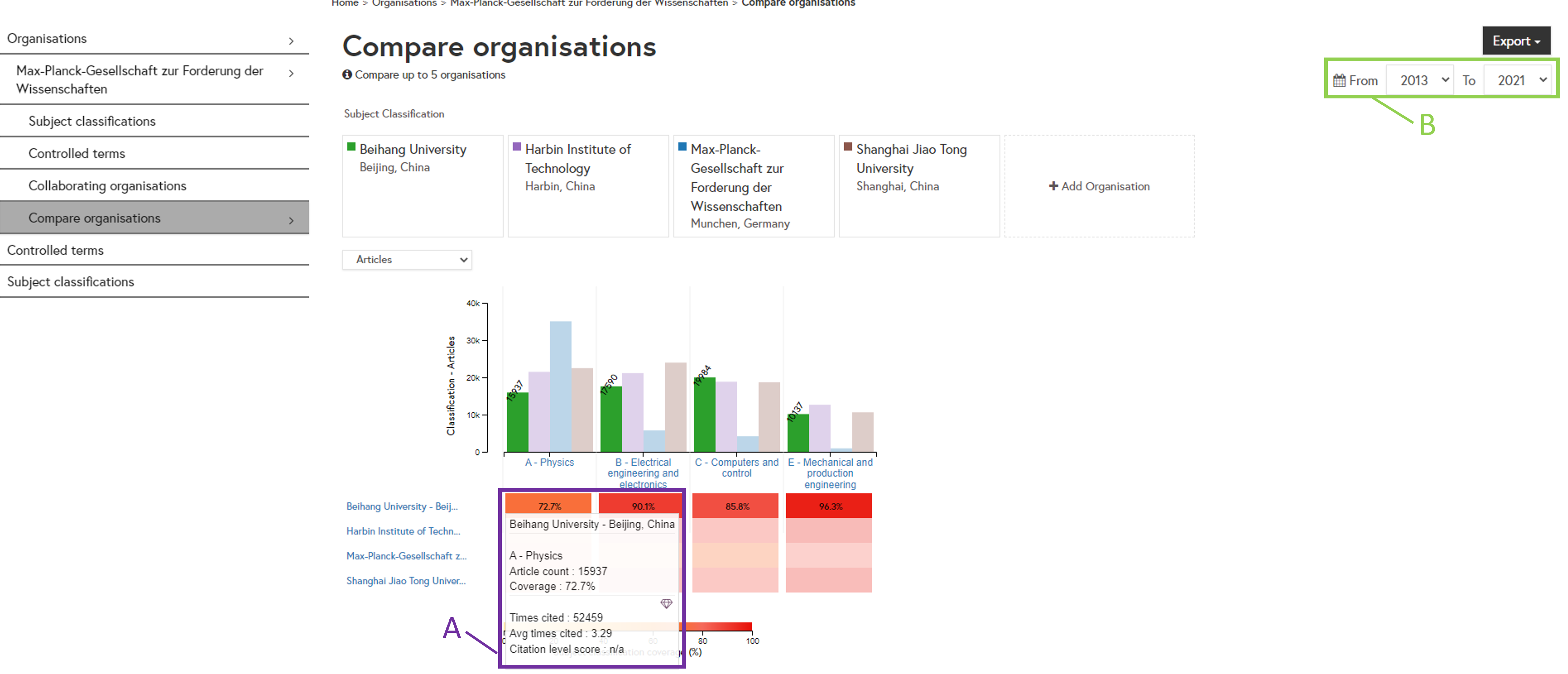 Histogram Chart (B): The histogram shows the total number of articles for each of your selected organisations within each subject classification. Inspec Analytics Plus only: Use the drop-down to update the histogram to show number of articles, number of citations or average number of citations.