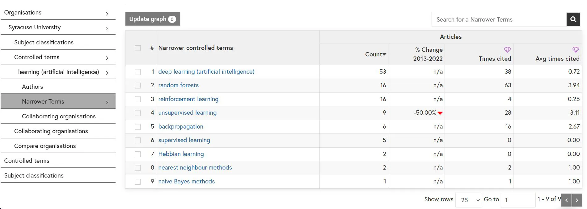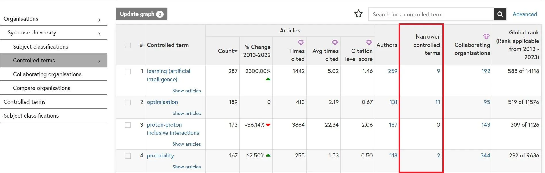Click the hyperlinked number in the “Narrower controlled terms” column to view an organisation’s output for those narrower terms.