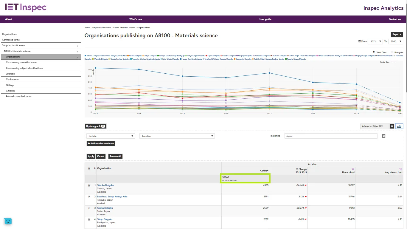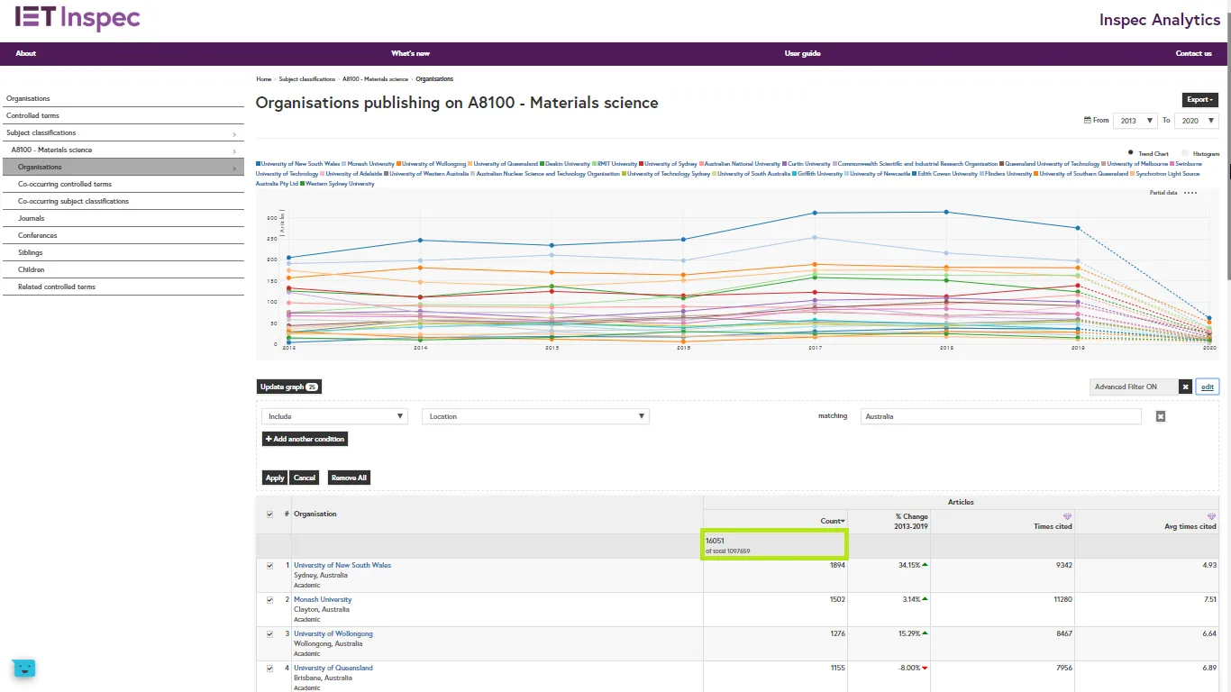 For example, in the Materials Science concept page, you can filter by location to see that there are 16,051 article affiliations on this subject for organisations in Australia, versus 52,800 for organisations in Japan.